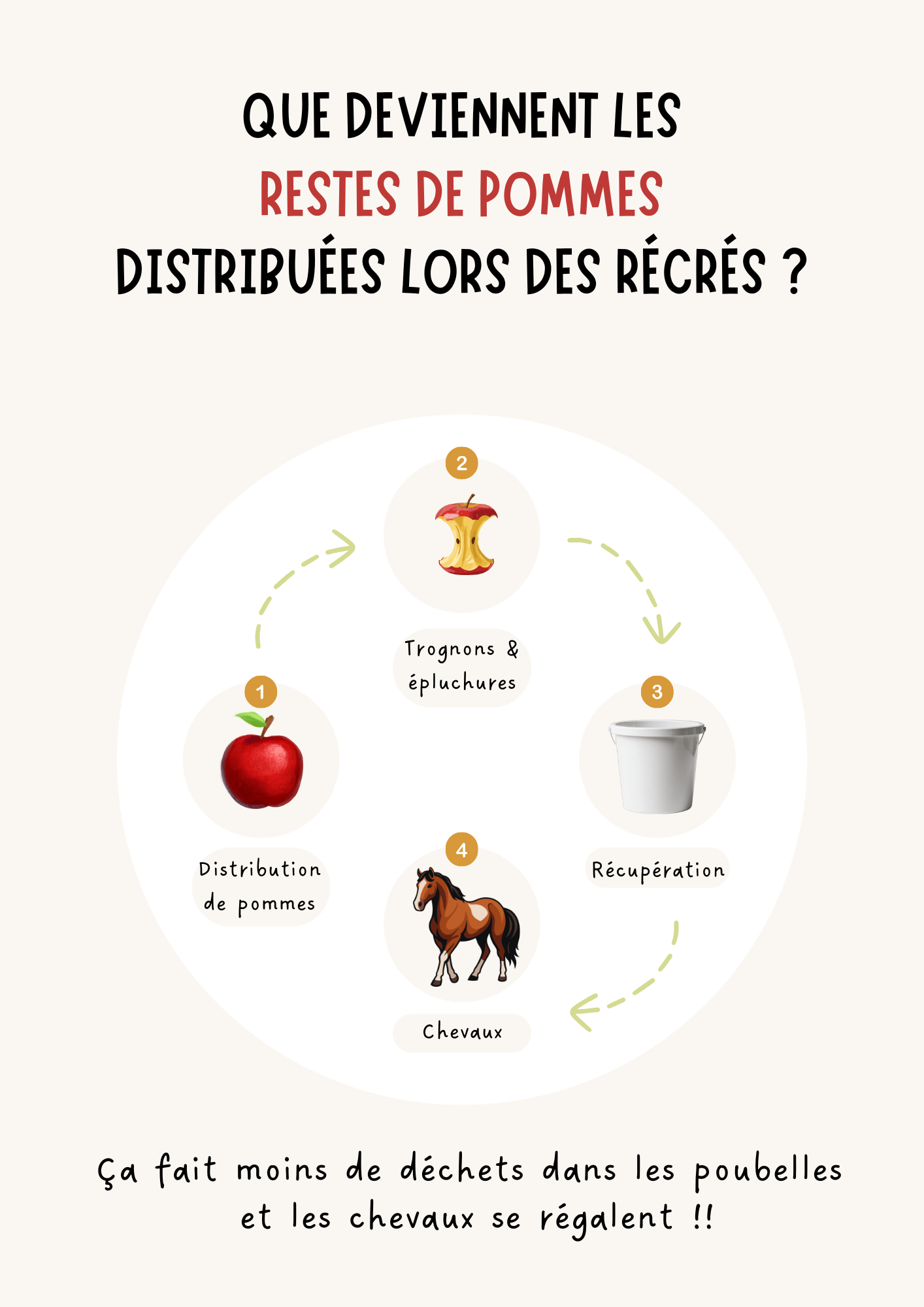 Ce sont des déchets compostables mais ils restent comestibles pour les animaux. Nous pouvons donc les récupérer et les donner à des chevaux pour leur quatre-heure ! (Attention, l'abus de pommes est déconseillé pour les chevaux ! Pas plus d'une distribution par semaine)