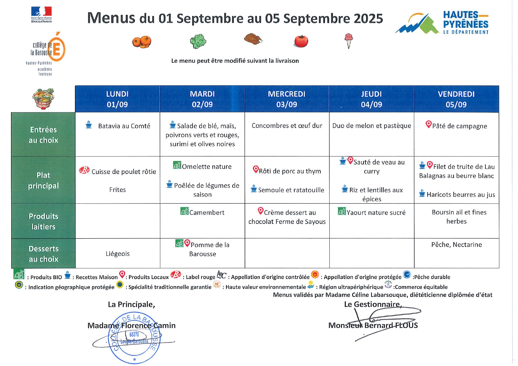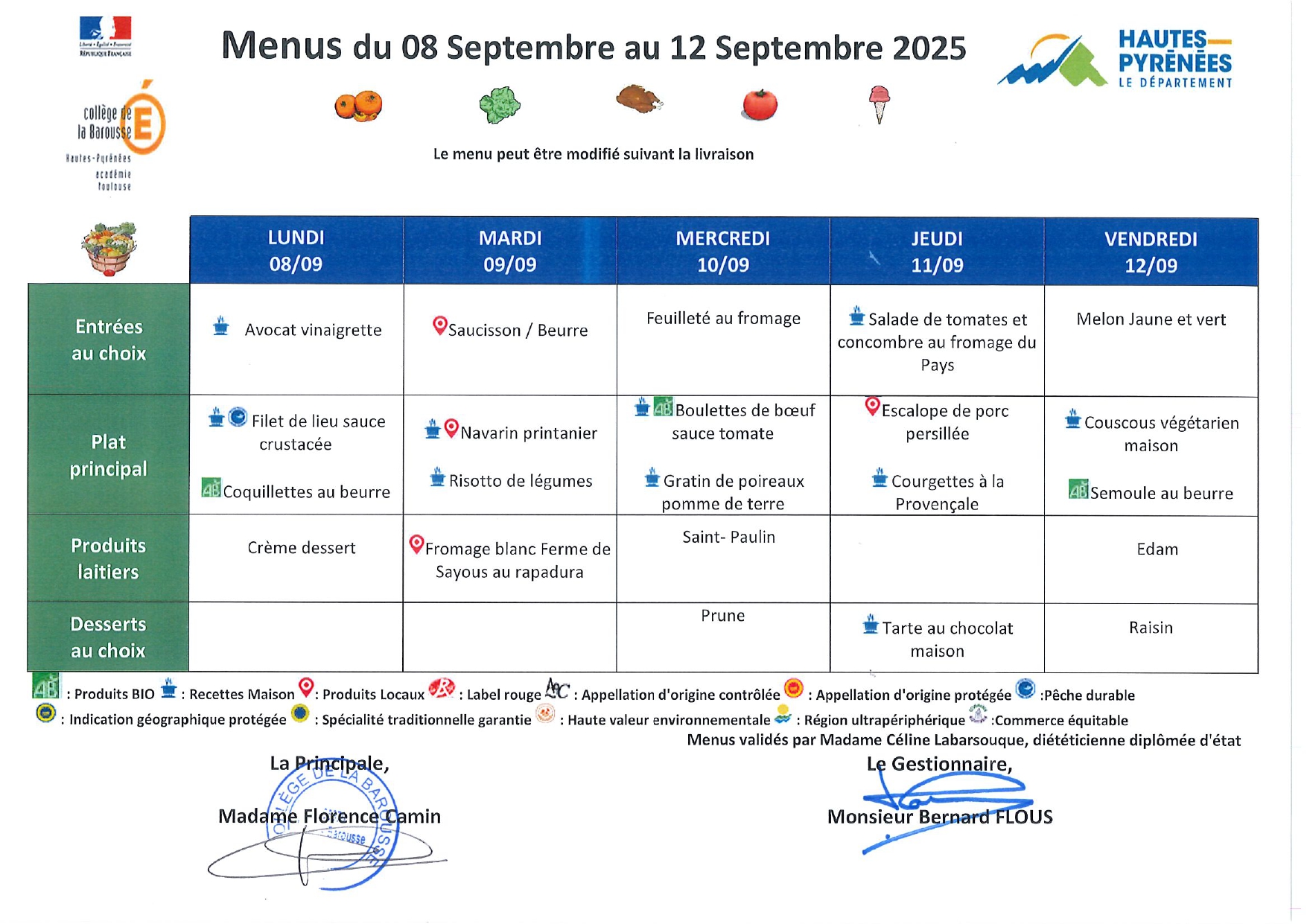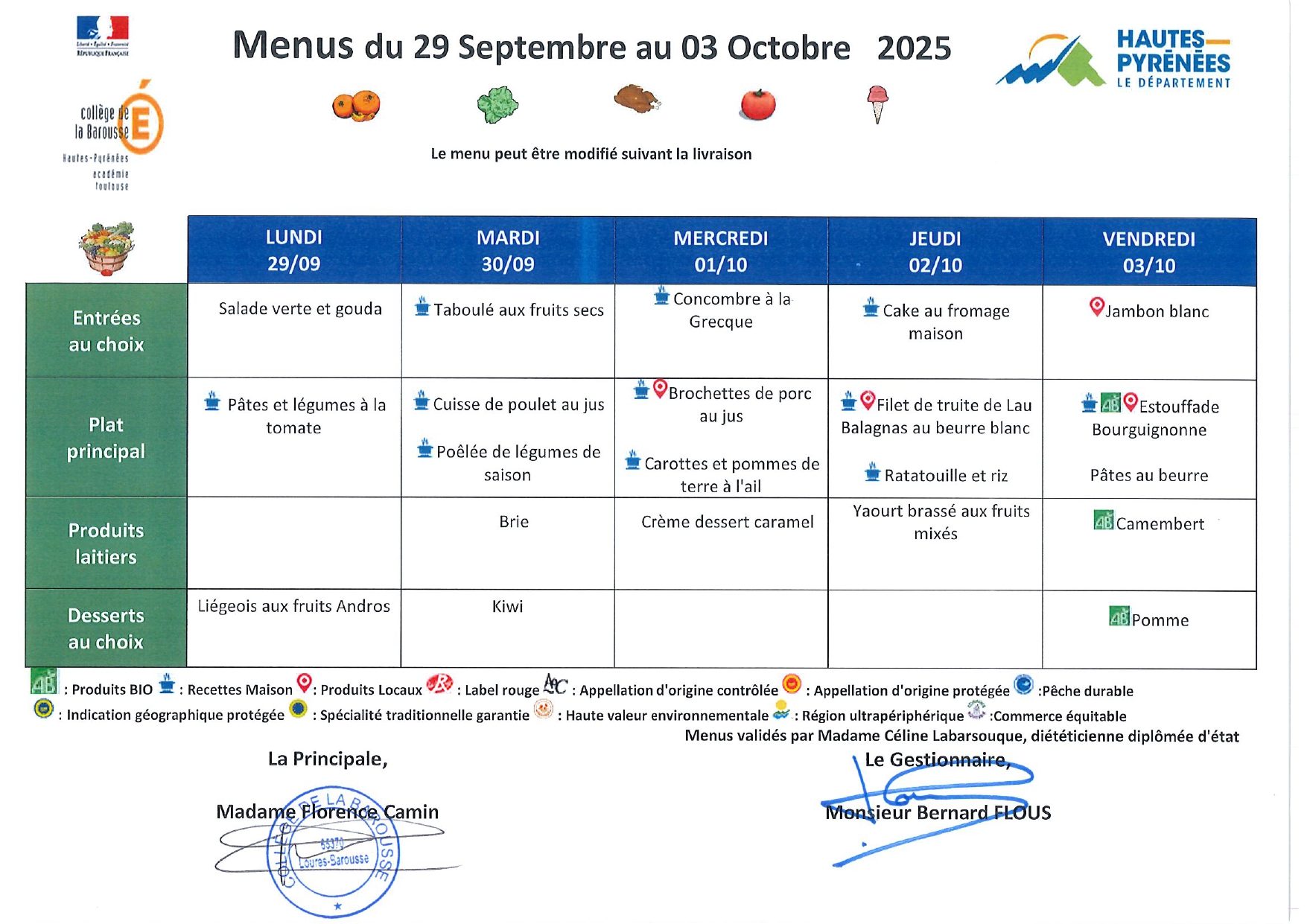 MENUS SELF période du 1er septembre au 17 octobre 2025