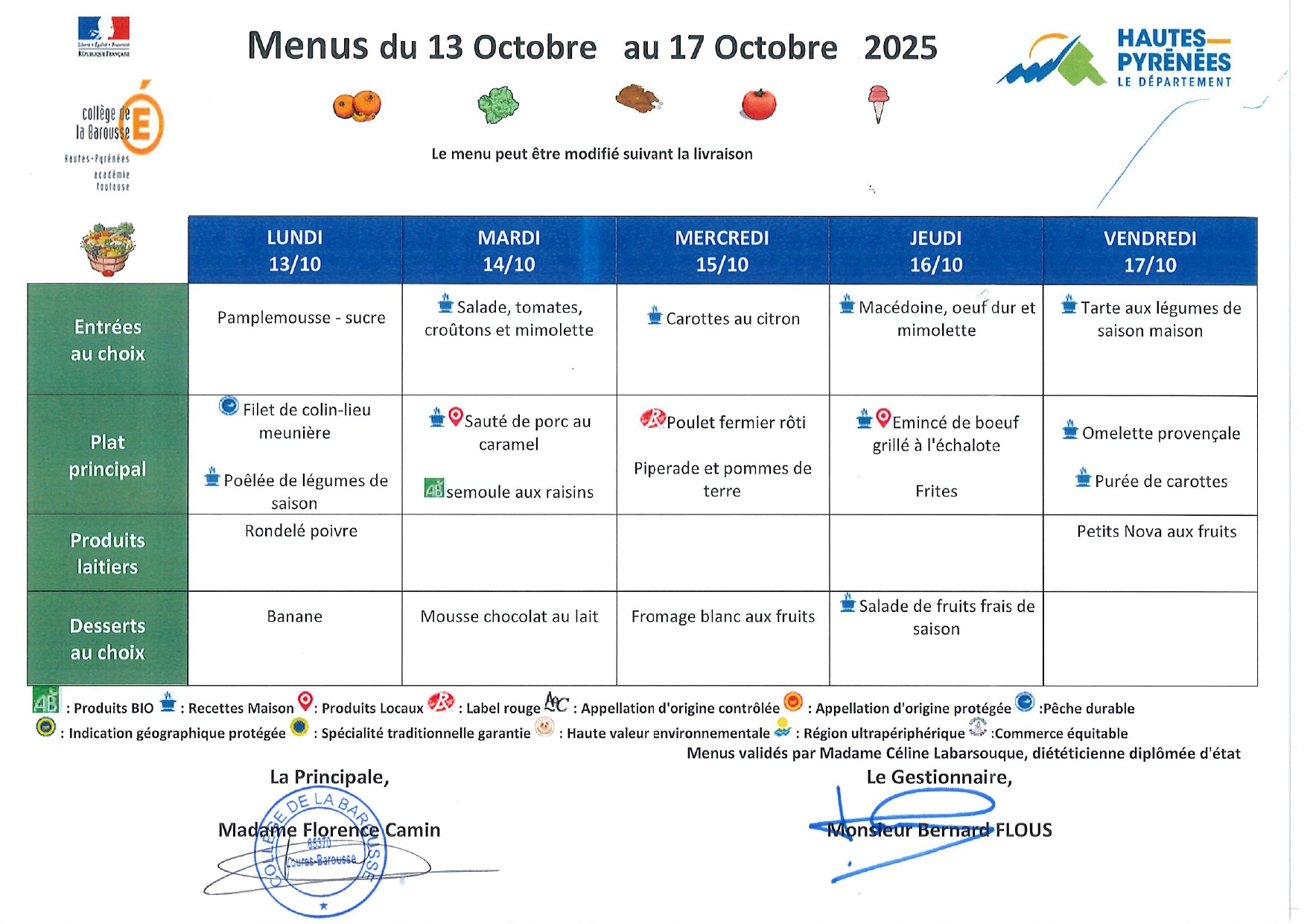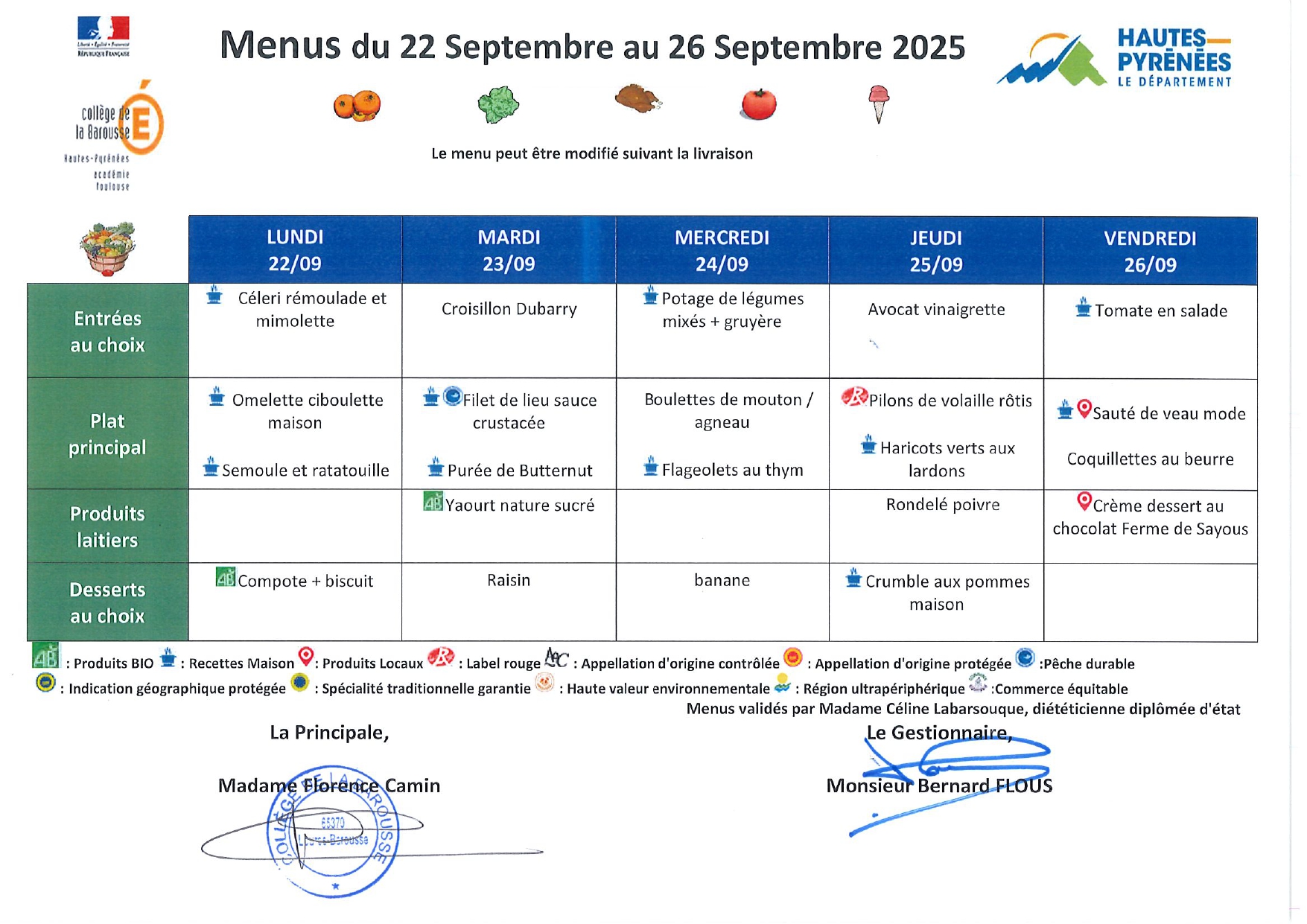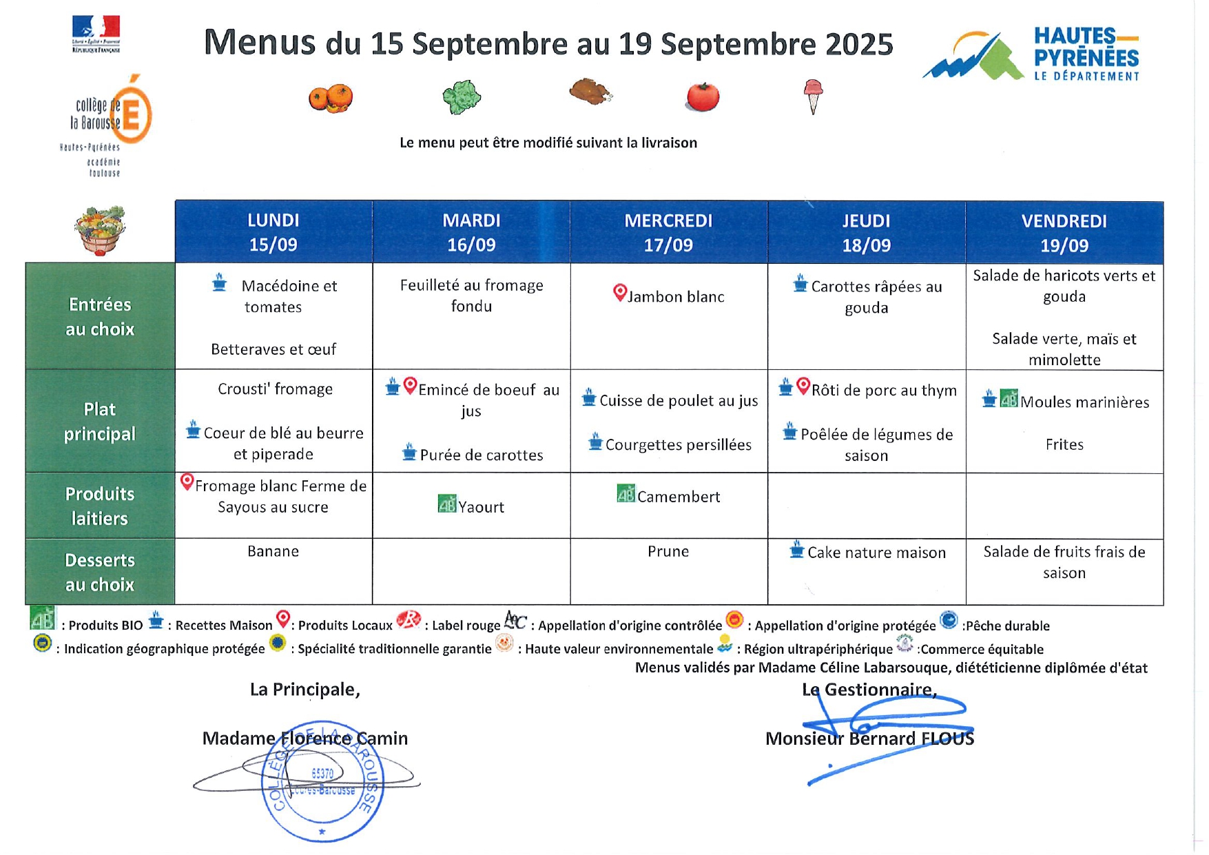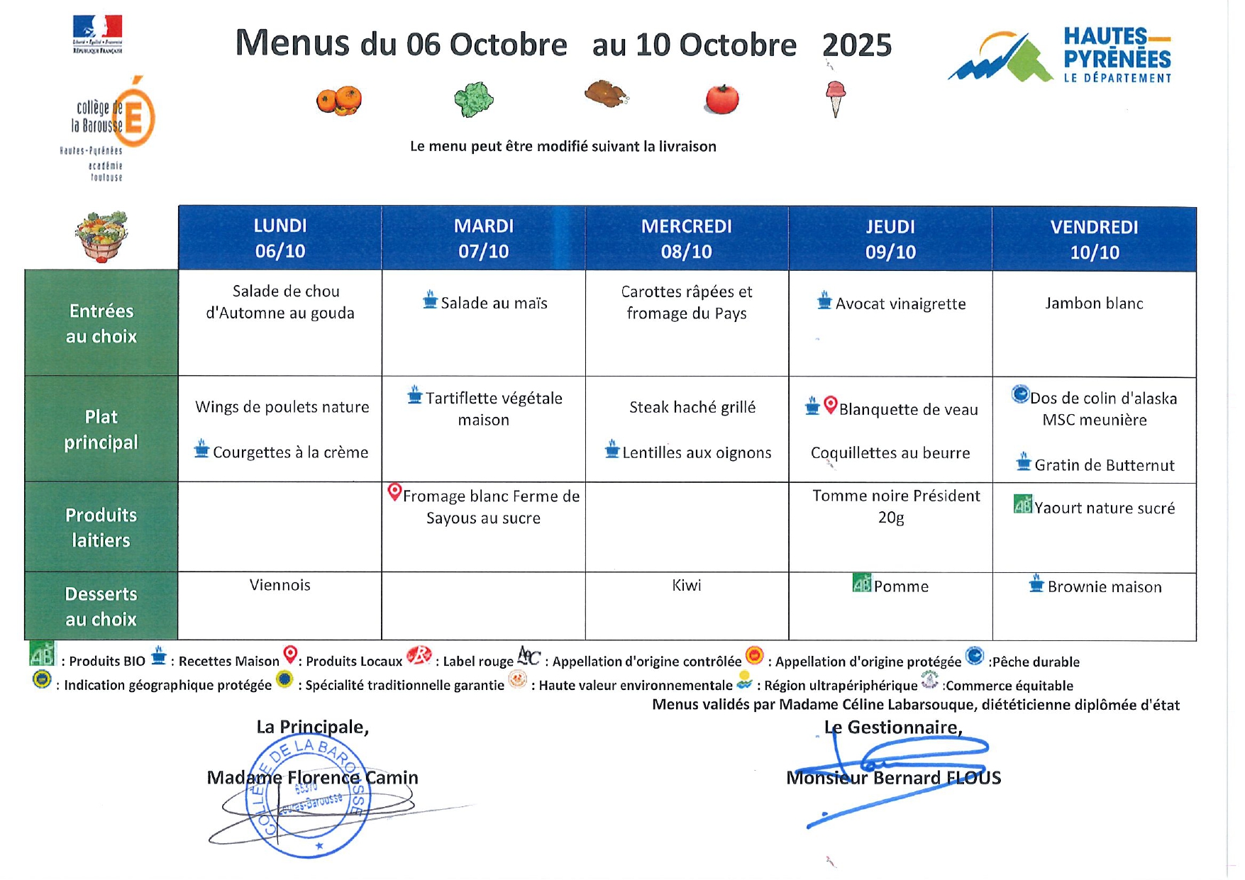 MENUS SELF période du 1er septembre au 17 octobre 2025