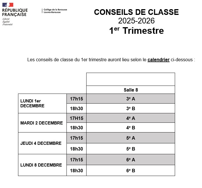 Je vous prie de bien vouloir trouver ci-dessous le calendrier des conseils de classe du 1er trimestre (sous réserve de modifications)